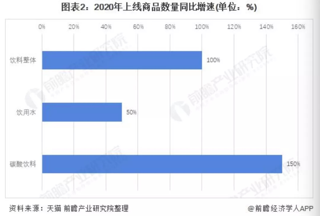 據統計,2020 年天貓上線商品數量中,飲料行業整體增長了 100%,其中飲用水增長 50%,碳酸飲料增長超過了 150%,說明碳酸飲料的受歡迎程度較高。
