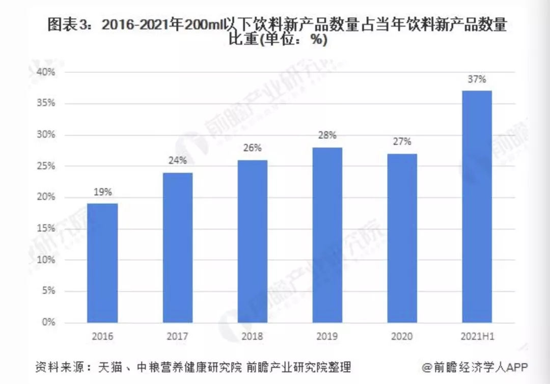 在上新的眾多碳酸飲料中,200ml 以下飲料新產品數量占當年飲料新產品數量比重也總體呈上升趨勢,2020 年這一占比達到了 37%,較 2019 年時提升了約 10 個百分點。