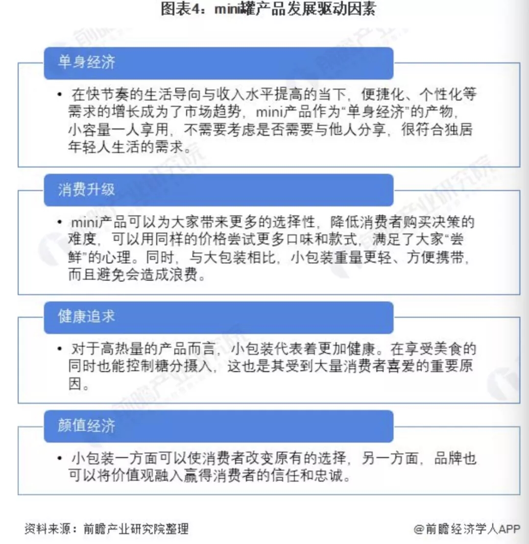 200ml 以下的飲料也叫 mini 罐飲料,這一類飲料產品逐漸受歡迎主要是受單身經濟發展的影響 ; 同時隨著人們消費的審計,mini 罐飲料既滿足了消費者的嘗鮮心理,又不容易造成浪費 ; 除此之外,消費者健康意識的提高以及顏值經濟的興起也促進了 mini 罐飲料產品的暢銷。