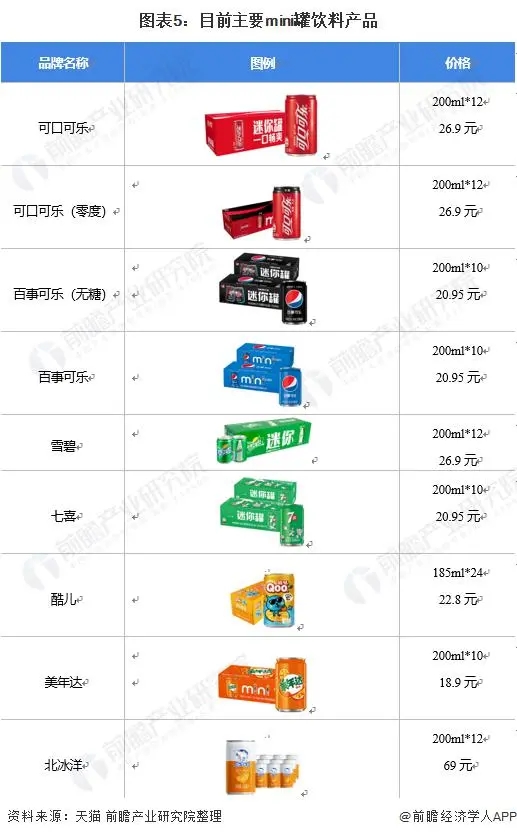 目前市場上較受歡迎的 mini 罐飲料產品有可口可樂、百事可樂、雪碧與七喜等,售價約在 2.25 元 / 罐,具體情況如下: